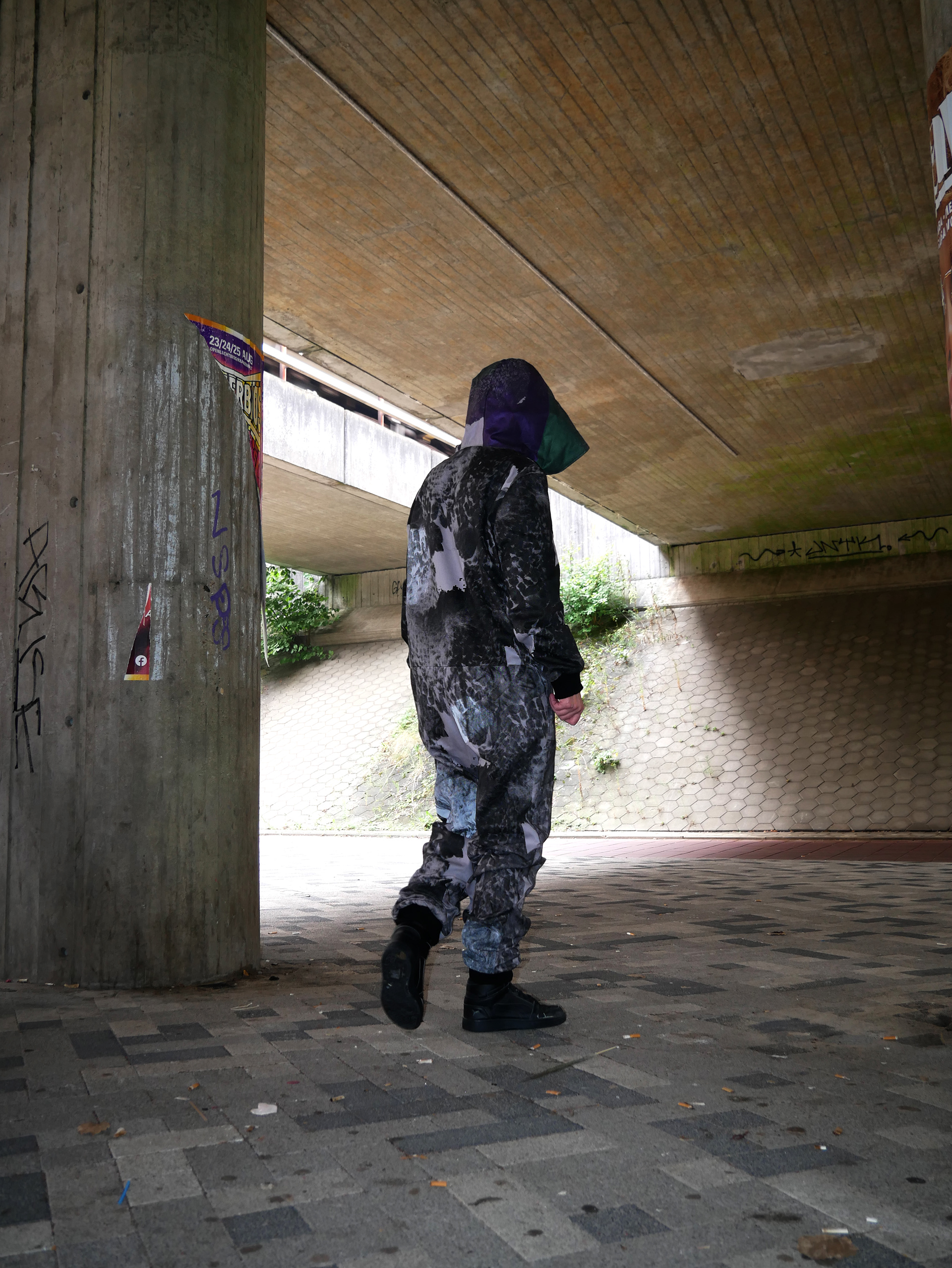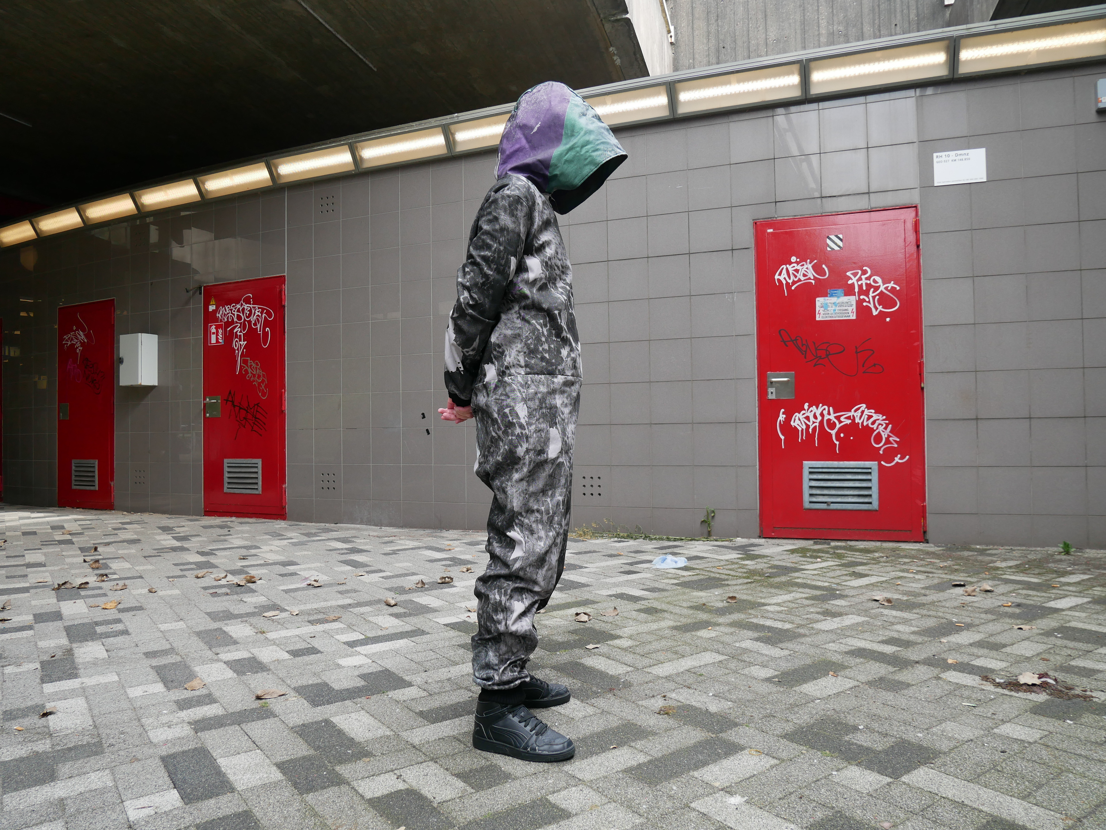 Research into city camouflage based on the adaptive qualities of the city pigeon. Next to the camouflage pattern blending into the environment, the onesie contains grafic elements and a reflective fabric inside the hood to distract camera's.