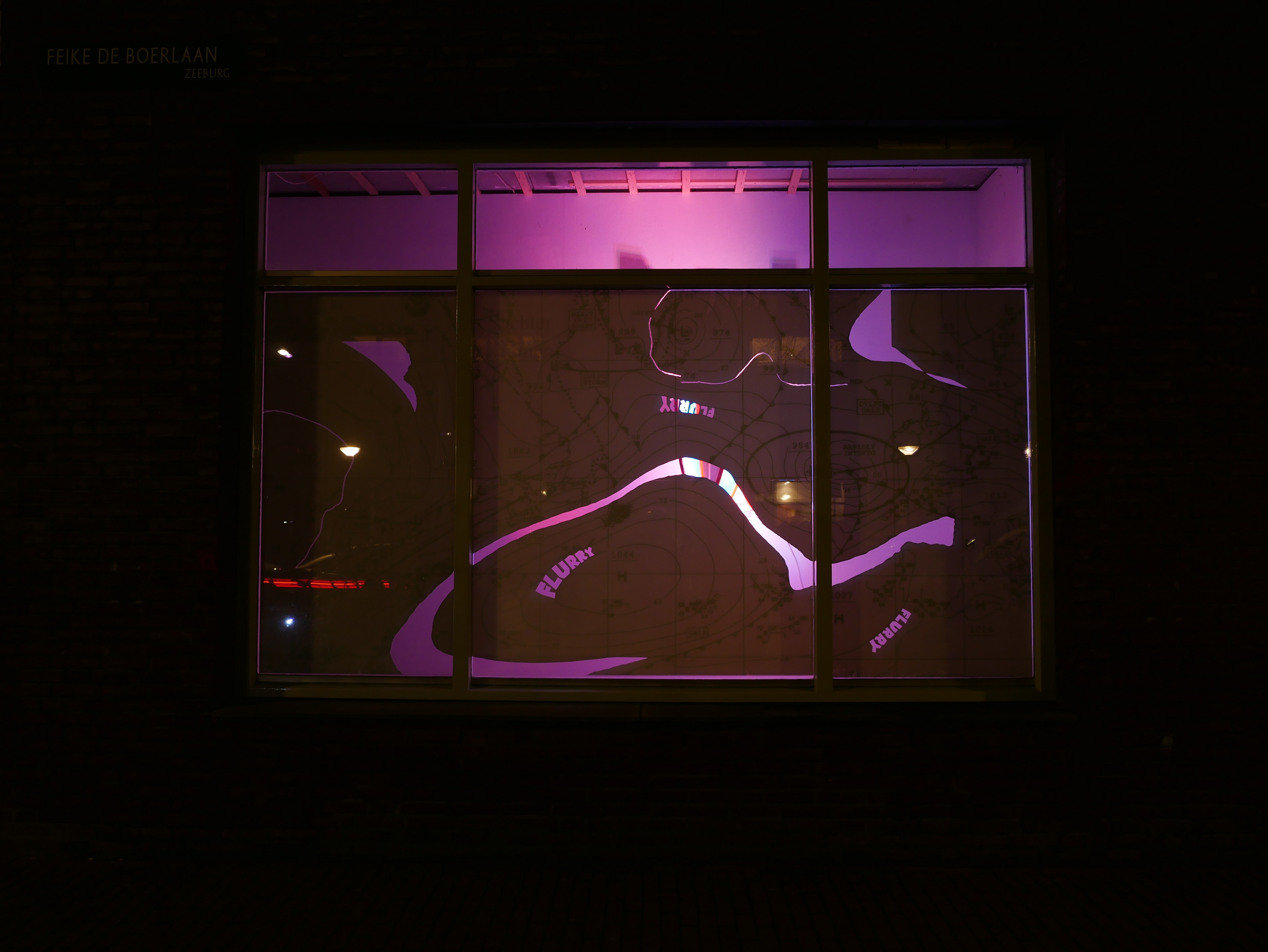 The installation transforms Achter de Ramen into an anti-darkstore filled with colourful light. A neon-sign is visible through the openings in the window stickers. Every hour the letter turns a quarter turn to form the word WE as an ode to collaboration.