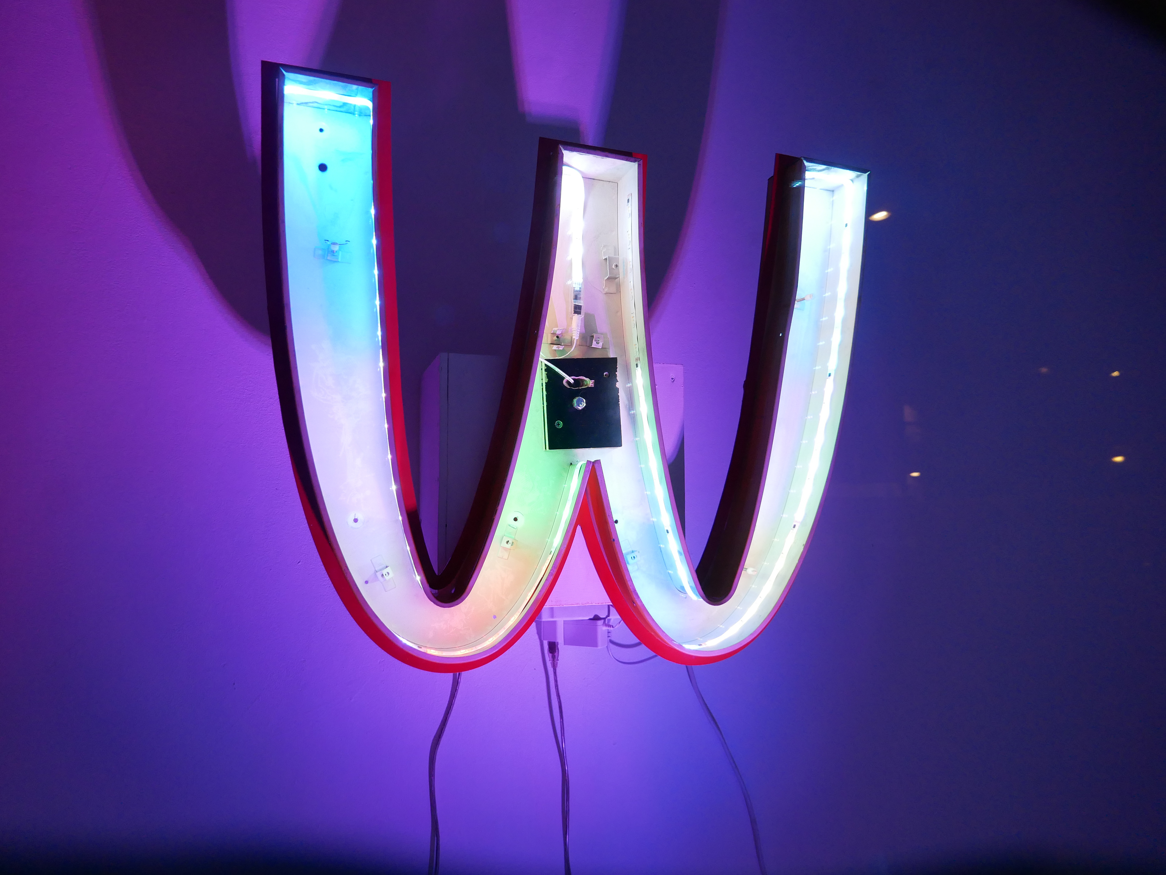 light installation with neon light box, led light, arduino, stepper motor, and window stickers, 2024