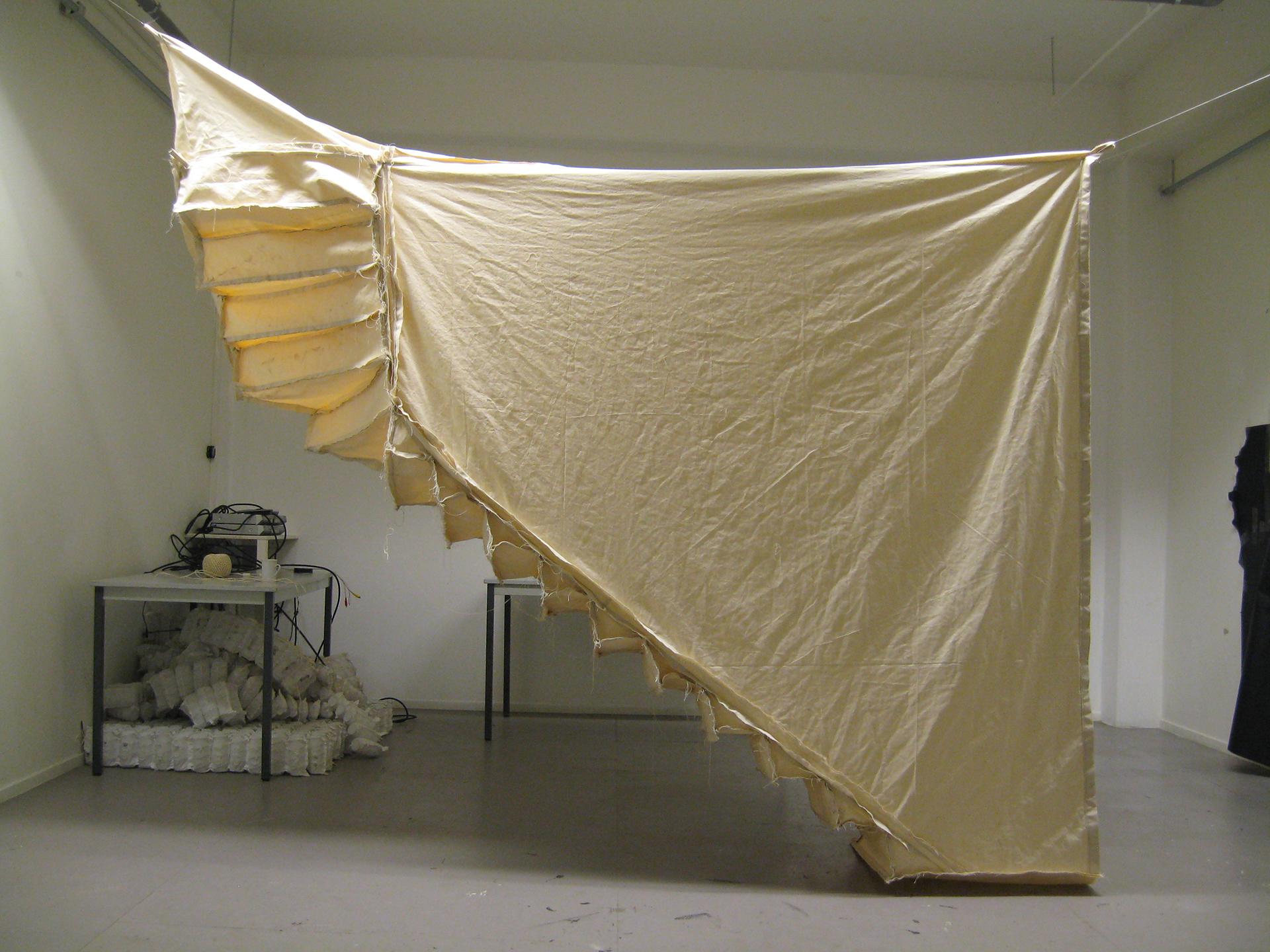 Cloth copy of the now demolished staircase of Maduratraat 36- a space in between privat and public, just shared by three neighbours. This remnant of a place can be folded up like a tent and reconstructed in a new location.